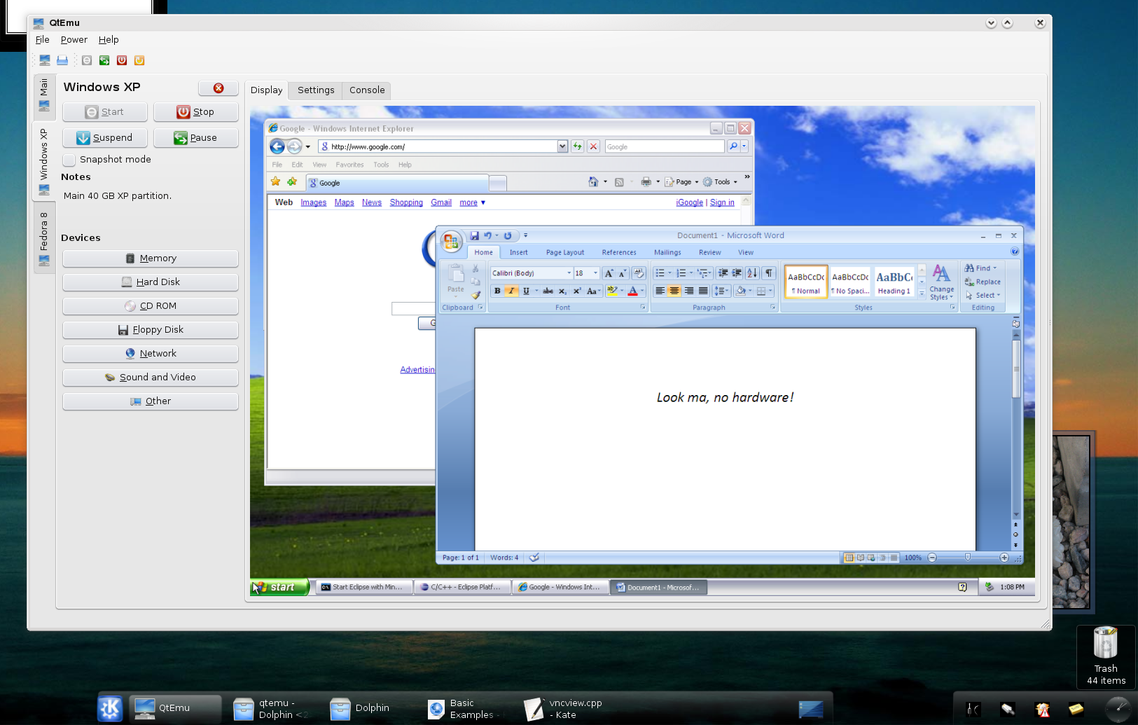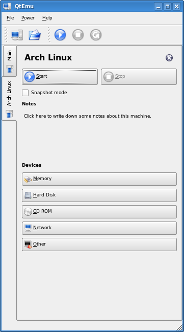 QtEmu is a graphical user interface for QEMU written in Qt4. It has the ability to run virtual operating systems on native systems. This way you can easily test a new operating system or try a Live CD on your system without any troubles and dangers.